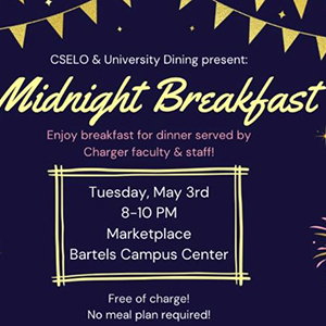 For those who don't know, Midnight Breakfast is a Charger tradition put on by the Center for Student Engagement, Leadership, and Orientation (CSELO) and University Dining where students can enjoy a “late night” breakfast and “charge up” with friends ahead of final exams!