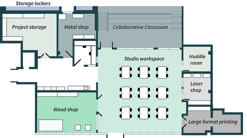 The Schaub Makerspace is designed to create a space where students, faculty and staff can come to teach, design projects and engage in experimental learning. The makerspace contains several working spaces: a collaborative classroom, a studio workspace, a team huddle room, a wood shop, a metal shop, a laser shop, a spray booth area, and multiple storage areas.