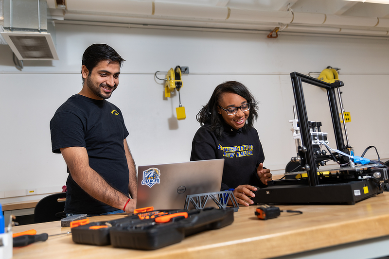 Located in the Bergami Center for Science Technology and innovation, the Schaub Makerspace offers the University of New Haven community access to cutting edge digital fabrication equipment including 3D printers, laser cutters, CNC machines, vinyl cutters and embroidery machines. The Schaub Makerspace is designed with collaboration in mind giving students, faculty and clubs the opportunity to bring ideas to life. The whole University of New Haven community is welcome so please stop by and introduce yourself.