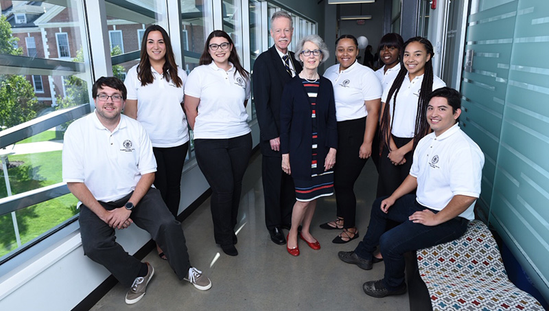 Left to right: Dominique Pendleton '20, Jennifer Edwards '20, Darwin Delgado '20, Daniella Nutile '20, Ashley DiScanio '18, '19 M.S. (Fellowship Coordinator), Hannah Glynn '20, Adjhani Benbow '20, and Nicholas Hill '20.