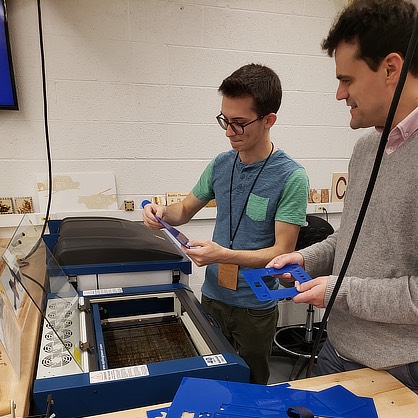 Austin Thomas (left) shows Simon Hutchinson, Ph.D., how to use a laser cutter.