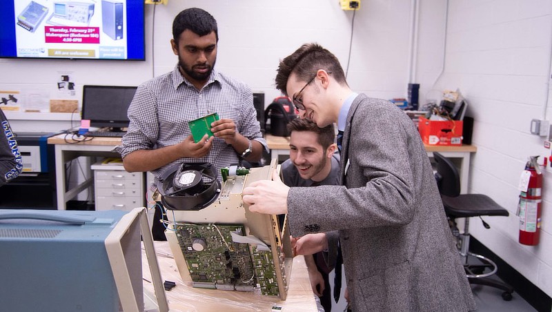 Austin Thomas (front) helps some of his fellow engineering students “tear down” electronics to see how they work.