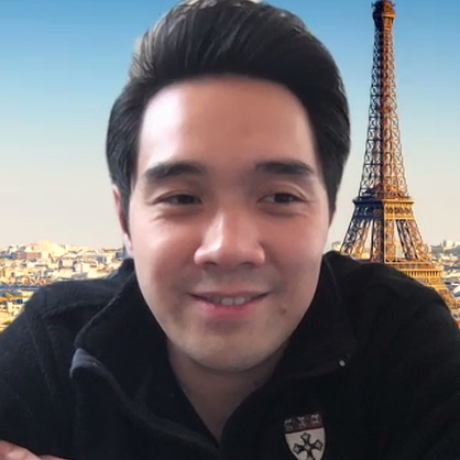 Alvin Tran connected with his colleagues in front of a Parisian background.