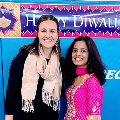 Tanu Sharma ’22 MBA (right) and Angela Karachristos, international employer relations manager for the University’s Career Development Center.
