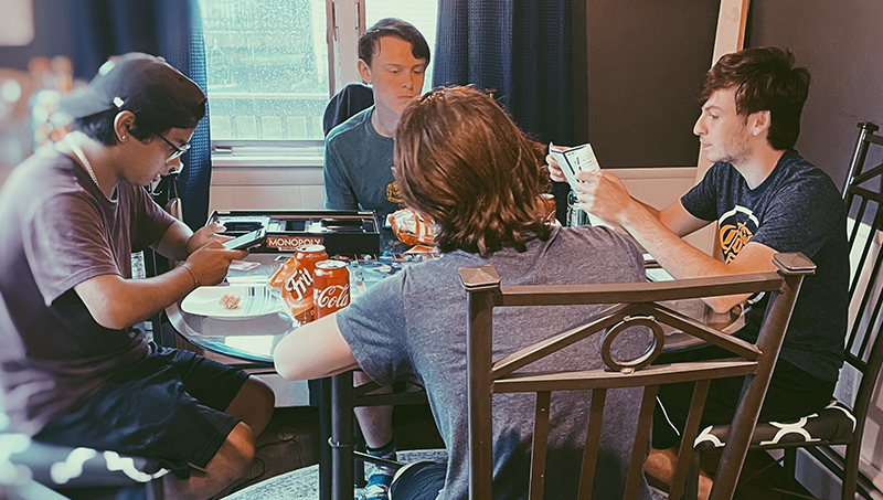 Michael Tirabassi '24 (in brown chair) rode out the storm with several of his fellow Chargers.