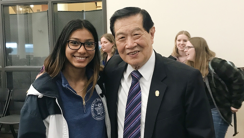 Johanna Elvir ’22 and world-renowned forensic scientist Henry C. Lee, Ph.D.