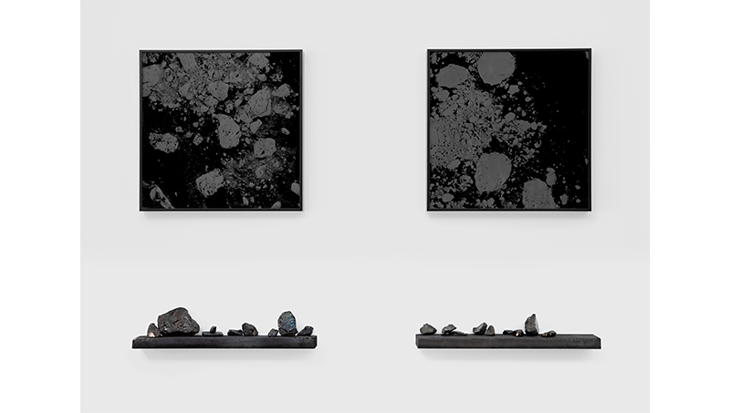 Multiplier, 2019, Laser etched acrylic, aluminum, burnt wood, and sea coal, 24 x 36 inches. The images are satellite views of the Arctic Sea ice breaking up.