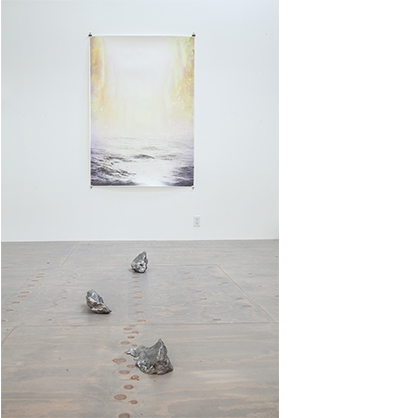 Open Water 16, 2018, ink, acrylic and graphite on paper, 62 x 43 inches, Installation view with Lost Monuments 3D scanned melted snow piles cast in aluminum.