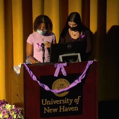 Students, faculty, and staff gathered in the University’s Bucknall Theater to celebrate Bernard’s life – many of them wearing purple, Bernard’s favorite color. Bernard’s family members came to the University from her home state of New Jersey to attend the vigil. Ventura and Madison Manzo ’23, both dressed in purple, sang “happy birthday” to Bernard at the podium, which was also decorated in purple.