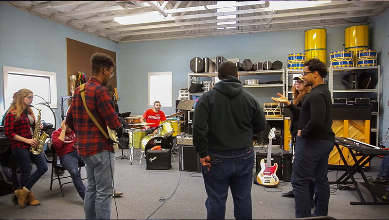 Patrick Rivers, Ph.D., (far right) and his students at a rehearsal in 2019.