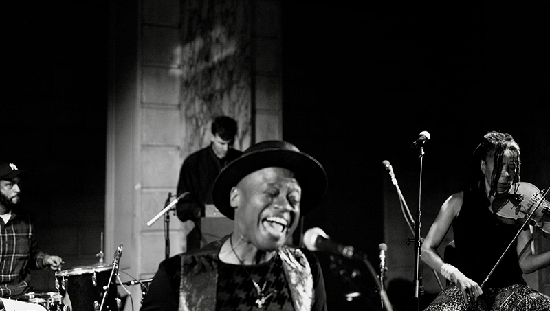 Radical Reversal includes Randall Horton (front), Devin Brahja Waldman, Melanie Dyer, and Tchester Holmes. (Photo credit: Thomas Sayers Ellis.)