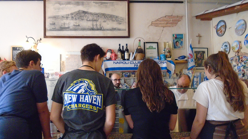 The students’ professor, Leonardo Borsacchi, Ph.D., helped translate as students learned from Tortora, who then gave each student their very own lesson. He explained how to gently flatten the dough after letting it rest, how to spread sauce on it, and, after adding the mozzarella and the oil, how to properly pick up the pizza with the peel and slide it into the oven.