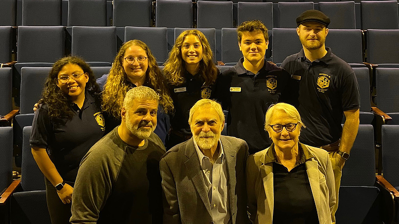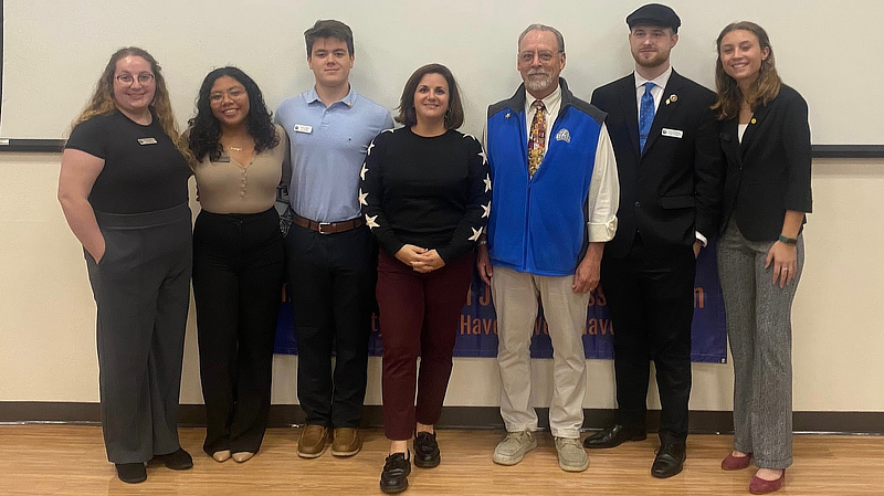 Psi Omega Executive Board with Wrongful Convictions Guest Speakers. Back left to right: Lizbeth Medrano ’24; Megan Ruoff ’24; Olivia Hall ’25; Noah DiNallo’24; Colin Graham ’23, ’24, M.S. Front left to right: Joseph Lopez, Richard Emmanuel, and Catherine Goodbody.