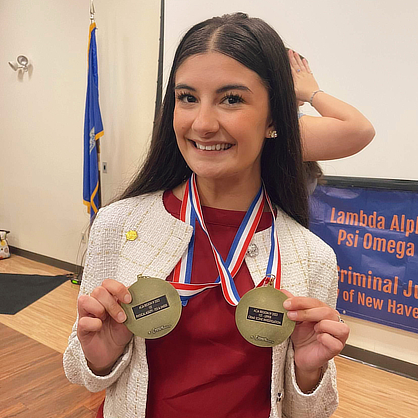 Psi Omega, Spirit Award; Matt Stalter, Criminal Law Lower Division 3rd Place; Sophia Lastorino, LAE Knowledge Lower Division 3rd Place & Crime Scene Investigation Lower Division 2nd Place; Caitlin Valko, LAE Knowledge Lower Division 2nd Place; Alexis Tierpack, LAE Knowledge Lower Division 1st Place & Corrections Lower Division 2nd Place; Zach Moore, Police Management Lower Division 2nd Place; Daniel Martinez, Physical Agility Male 25 & Under 3rd Place; Alex Riccardo, Physical Agility Male 25 & Under 2nd Place; Ben Cap, Physical Agility Male 25 & Under 2nd Place; Jade Colon, Crime Scene Investigation Lower Division 2nd Place; Diane Weiss, Crime Scene Investigation Lower Division 2nd Place; Madeline Hall, Crime Scene Investigation Lower Division 1st Place; Megan Kirk, Crime Scene Investigation Lower Division 1st Place; Lauren Grenci, Crime Scene Investigation Lower Division 1st Place; Emily Schweigert, Criminal Law Upper Division 3rd Place, LAE Knowledge Upper Division 2nd Place, Juvenile Justice Upper Division 1st Place, & Corrections Upper Division 3rd Place; Olivia Hall, LAE Knowledge Upper Division 3rd Place & Crime Scene Investigation Upper Division 1st Place; Noah DiNallo, LAE Knowledge Upper Division 1st Place & Crime Scene Investigation Upper Division 1st Place; Madison Savarese, Corrections Upper Division 2nd Place; Skylar Galvez, Physical Agility Female 25 & Under 3rd Place & Crime Scene Investigation Upper Division 2nd Place; Bella Douglas, Physical Agility Female 25 & Under 1st Place & Crime Scene Investigation Upper Division 1st Place; Megan Ruoff, Crime Scene Investigation Upper Division 2nd Place; Emily Fleury, Crime Scene Investigation Upper Division 2nd Place; Colin Graham, Criminal Law Professional Division 3rd Place, LAE Knowledge Professional Division 3rd Place, Police Management Professional Division 1st Place, & Crime Scene Investigation Professional Division 3rd Place; Danielle Erwin, Juvenile Justice Professional Division 1st Place, Police Management Professional Division 3rd Place, Corrections Professional Division 2nd Place, & Crime Scene Investigation Professional Division 3rd Place; Vanessa Schenking, Crime Scene Investigation Professional Division 3rd Place.