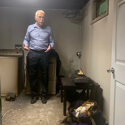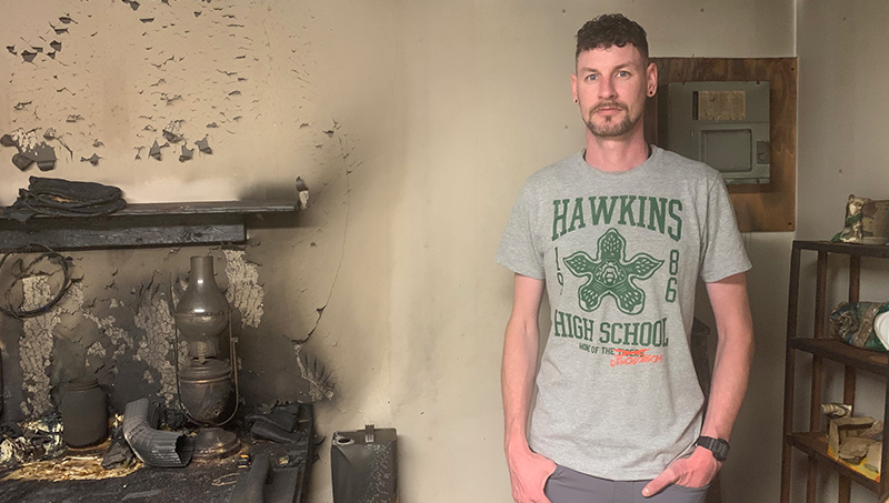 Francis Reynolds ’25 M.S. stands in one of the “classrooms” where he and his classmates apply what they’ve been learning as part of their coursework. This space is no ordinary classroom – the smell of fire lingers in the air, and the interior is charred. It’s the perfect space for fire science students such as Reynolds to learn.