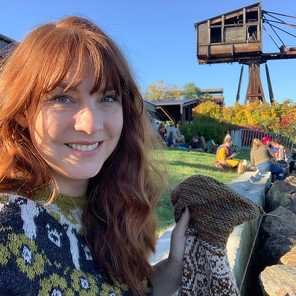 Lauren Slingluff at a fiber festival in a hand knit sweater and working on another knitting project.