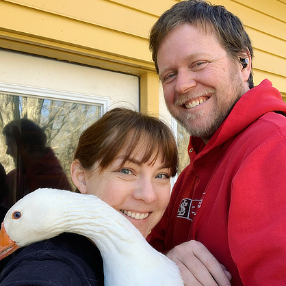 Lauren Slingluff, her husband Rick, and one of their geese, Bo.