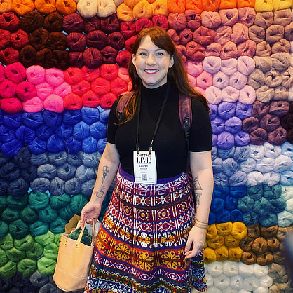 Lauren Slingluff at Vogue Knitting Live in a skirt she knit.