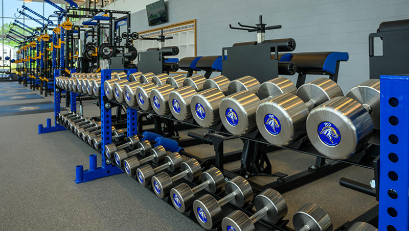 The new facility offers a world-class weight room full of natural light and stocked with top-of-the-line equipment, from dumbbells emblazoned with the Charger logo (the logo rotates so that the Charger is always upright, no matter how the weights are stacked) to a Charger blue and gold turf area. Student-athletes can also get in their cardio on the second level, where they can run on treadmills overlooking the weight training area.