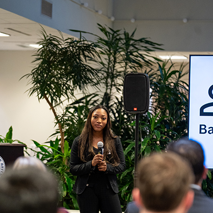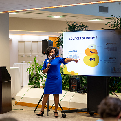 Kiana White '23, '24 M.S. delivers her pitch to the panel of judges.