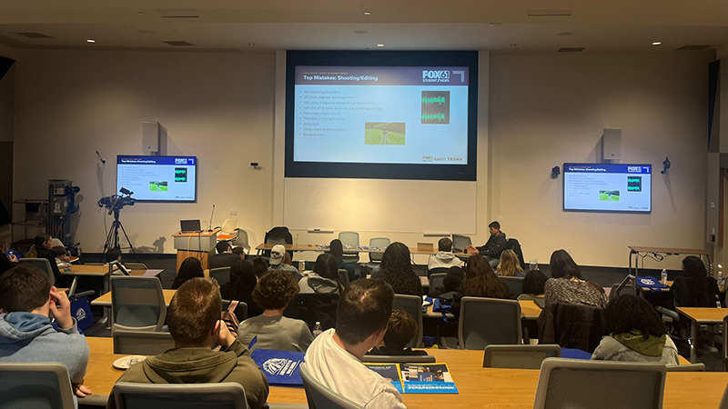 This spring, Liz Salvatore, community marketing manager for Fox61, and Freddie Matthis, assistant chief photographer, visited the University to interact with a large group of high school students from varying schools around Connecticut, presenting an insightful workshop in the Bergami Center for Science, Technology, and Innovation.
