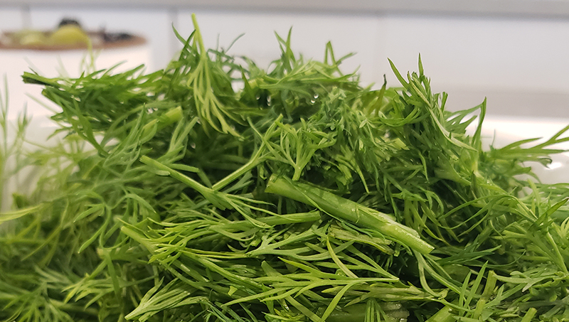 Beatrice Glaviano ’26 prepares a bowl of dill to use in a dish.