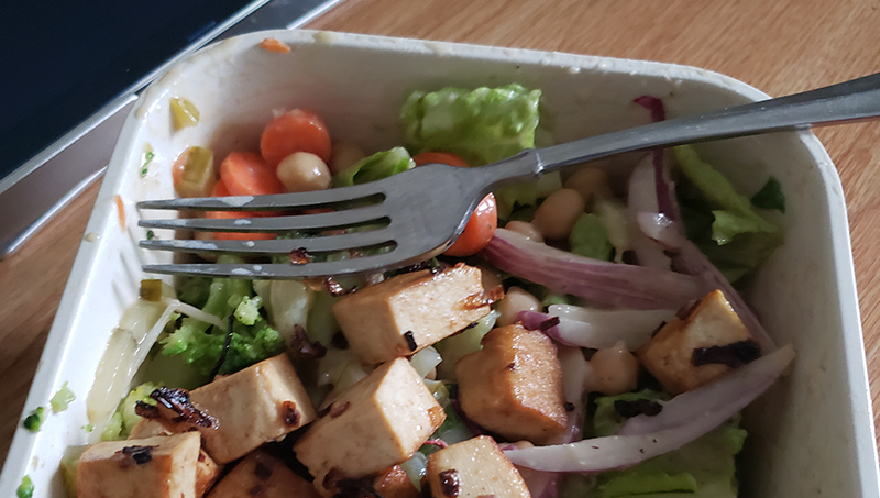 Freshly pan-fried tofu, however the heck you like your salad mixture to be composed of, and Trader Joe’s Vegan Caesar Salad dressing