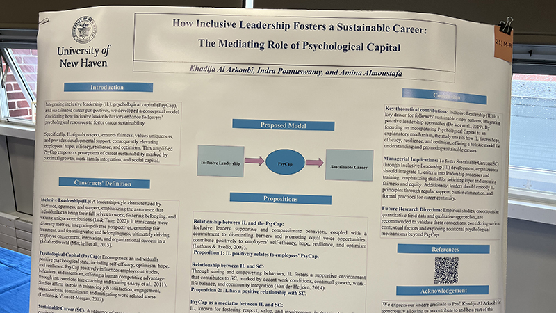 Ponnuswamy and her classmate Amina Almoustafa ’24 M.S. were inspired by today’s ever-evolving global landscape, and they recognize how important it is for employees to have the opportunity to cultivate sustainable careers. Intrigued by the importance of inclusive leadership and its potential to foster psychological capital, they believed it could contribute to sustainable career development.