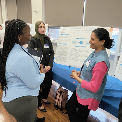 Amina Almoustafa ’24 M.S. (center) and Indra Ponnuswamy ’24 M.S. (right) discussed their work with their fellow Chargers.