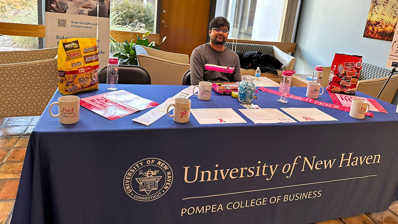 Kriston Pal ’24 M.S. raises awareness of breast cancer at a table on campus.