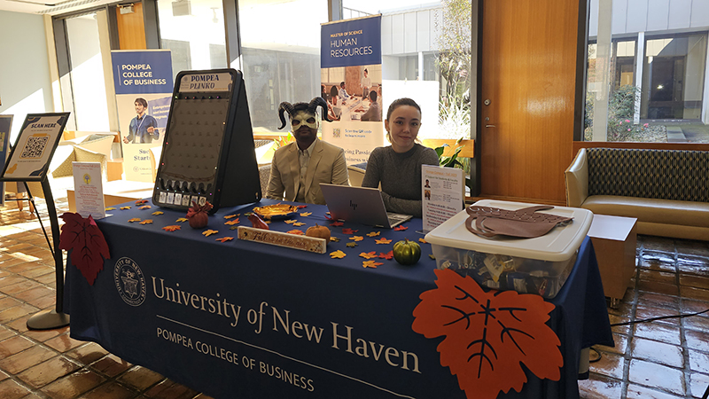 Kriston Pal ’24 M.S. (left) represents the University’s Pompea College of Business on campus.
