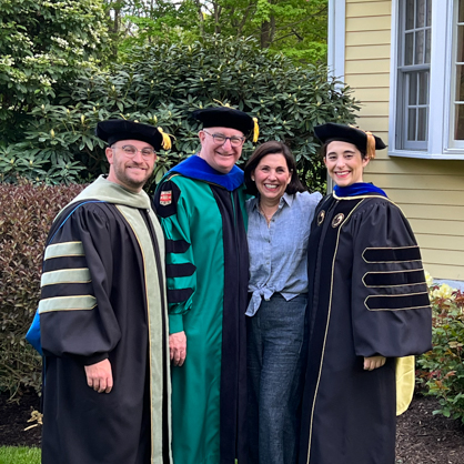 Brian A. Marks, J.D., Ph.D., looks on as his son, Aaron S. Marks ’24 DHSc shakes hands with President Jens Frederiksen, Ph.D., at Commencement