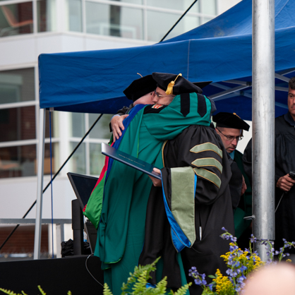 Aaron S. Marks ’24 embraces his father, Brian A. Marks , J.D., Ph.D. at Commencement