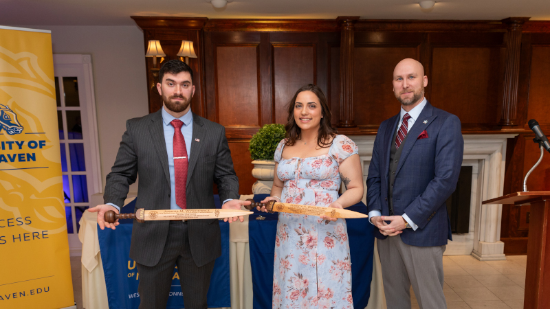 Joshua Wyskiewicz ’25 (left) and Jessica Guglielmo '24 each received a Rudis, a wooden sword with a history extending back to Ancient Rome. Ryan Noonan '20, '23 M.S. is on the right.