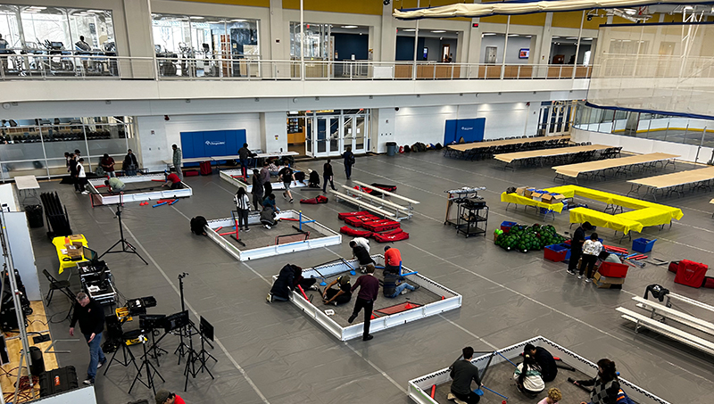 We recently hosted a competition event in the Beckerman Recreation Center, providing 38 teams of local high school students with a way to show off their STEM skills. Organizing this event was a team effort between my team and the faculty. The Robotics Club e-board took charge of recruiting a group of people to help with set-up and teardown and boy did we need them. We showed up with a small army of approximately 35 people and jumped into action. A few hours of work later, the Beckerman Center was transformed into a robotics competition area fit for nearly 200 students.