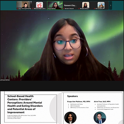 Alvin Tran, ScD, MPH, and Krupa Ann Mathew, ’25 MPH recently had the opportunity to present their research on identifying and treating eating disorders to a group of healthcare providers working in school-based health centers, earning a strong endorsement from an important Connecticut leader.