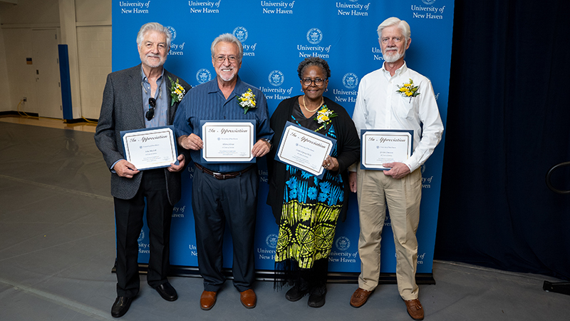 John Mitchell ’83, Al Celotto, Linda Copney-Okeke ’91, ’94, ’02 M.A., and Gordon Simerson, Ph.D., are all celebrating 40 years of service at the University of New Haven.