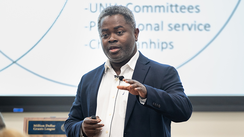 Kagya Amoako, Ph.D., associate professor of Biomedical Engineering, delivers the 'Last Lecture.'