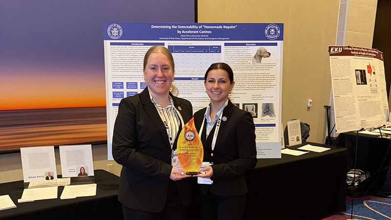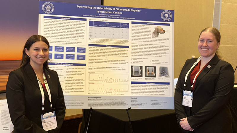 University of New Haven students Lauren Mulinski ’25 and Alison Perry ’24, MS ’26 were awarded “Best Overall Research Poster” at the International Association of Arson Investigators’ International Training Conference for their project examining homemade napalm detection by accelerant canines.