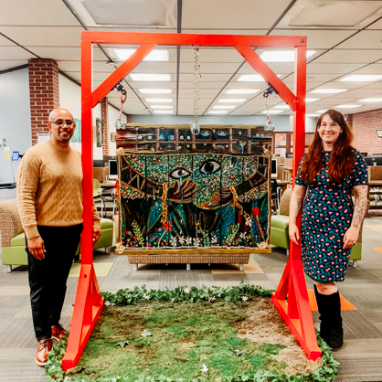 Artist Hector Rodriguez (left) with university librarian Lauren Slingluff, M.S (right)