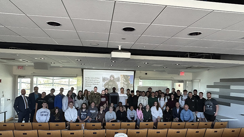 Similarly, Alex Anderson ’28, a homeland security major, felt that meeting Sr. Lt. Melnyk offered an experience and insight that couldn’t be gained through the media alone. He said, “The media does not always show everything that goes on with the Russia and Ukraine war, so to have the opportunity to hear from a Ukrainian soldier who was on the front lines and hear his perspective on things was very educational for me.”