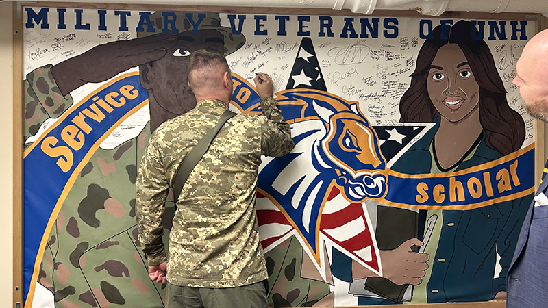 Sr. Lt. Mykola Melnyk signing a wall of honor at University’s Military and Veterans Center, with Ryan Noonan, Manager of Military & Veterans Affairs looking on.