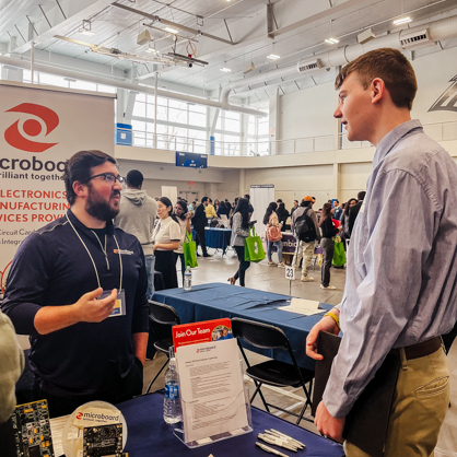 Students saw the fair as a way to get their foot in the door. “I’m looking for a summer internship,” said Justin Vaillancourt ’27, a mechanical engineering student. “Even if a company isn’t hiring right now, I still want to talk to them, get my name out there, and make those connections.”