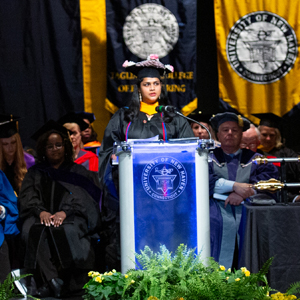 While serving in dual law enforcement and military careers, she was deployed in support of Operation Iraqi Freedom in 2003. While completing a tour of duty in Afghanistan in support of Operation Enduring Freedom in 2009, she was awarded the Bronze Star Medal. She said her family and friends provided the support she needed to pursue her dreams, and she encouraged the Class of 2019 to recognize those who helped them along the way.