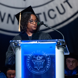 Regina Rush-Kittle, the deputy commissioner of the state of Connecticut’s Division of Emergency Management and Homeland Security, gave the keynote address and received an honorary degree at the afternoon Commencement ceremony for graduates of the University’s College of Business and Henry C. Lee College of Criminal Justice and Forensic Sciences.