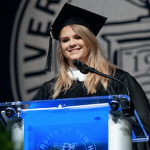 Speaking on behalf of the graduate student body, Marlo Keba ’19 M.A., who earned a master’s degree in industrial and organizational psychology, admitted there were times as a student – even when preparing her speech – when she felt she was not good enough.