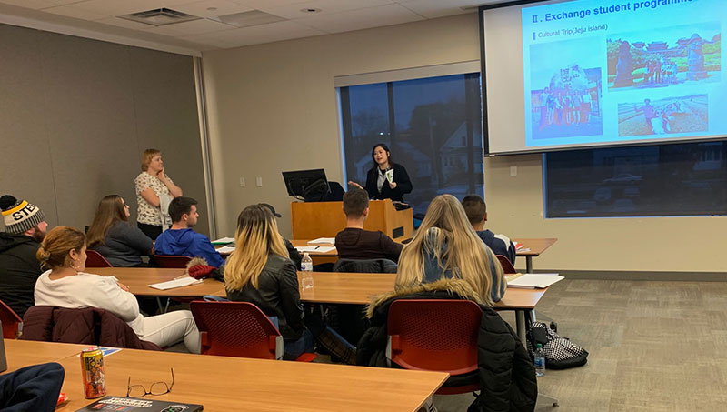 One of the guests from KNPU was Shinyoung “Esther” Seo, who provides support for exchange students. During her time on campus, she sat in on a criminal justice class and told students about the program and KNPU, discussing the cultural learning opportunities, campus life, and alumni success. She says she enjoyed meeting students and exploring the campus.
