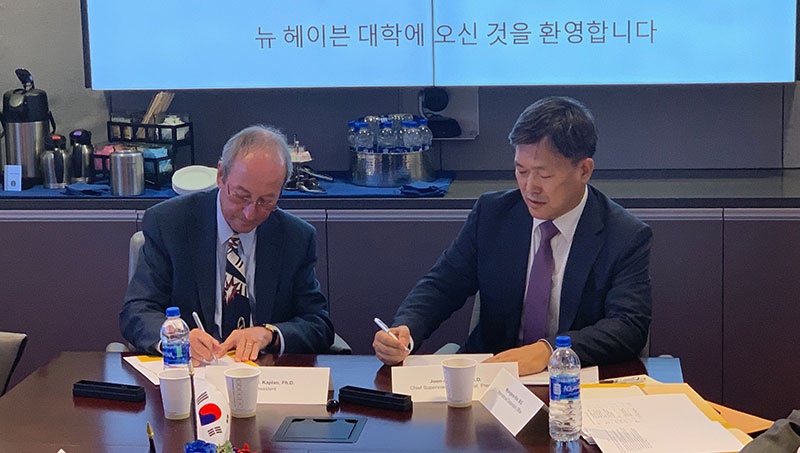 Recently, five representatives from KNPU made the trip to the United States. They visited the University of New Haven, toured the campus, and met with students, faculty, and staff. University of New Haven President Steven Kaplan, Ph.D. and Joon-seob Lee, Ph.D., KNPU chief superintendent general and president, took part in a signing ceremony to extend the exchange program between the two institutions.
