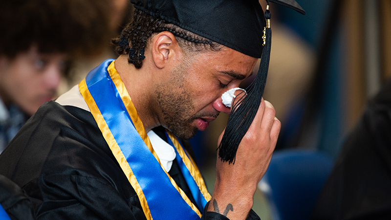 Despite that message he received at a tender age, Blackwell has been committed to changing the narrative of his life – in particular, through education. During his time in the program, he found reading works by authors such as Toni Morrison and James Baldwin to be particularly impactful. His coursework was an opportunity to begin to overwrite the "prophecy of prison." Standing before his fellow graduates in his cap and gown, he discussed his inspiration to rewrite his story – and encouraged them to do the same.