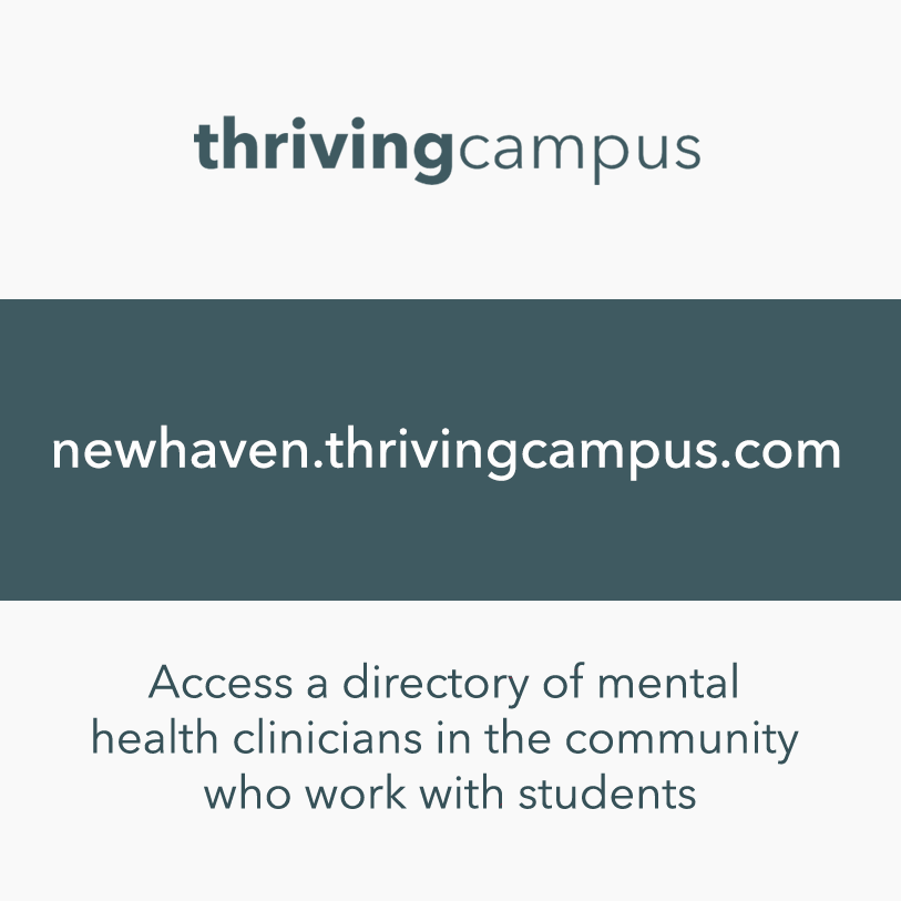 CAPS is also partnered with Thriving Campus, a network that helps college students connect with off-campus care providers in the community. Students can access the dedicated University of New Haven provider directory using this link: https://newhaven.thrivingcampus.com/